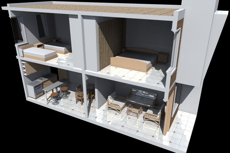 Esta propuesta esquemática es una vivienda de interés social. En el primer nivel: sala, comedor, cocina y baño social, en el segundo nivel poseen dos habitaciones y un baño completo. En fachada se demarca como un volumen importante el área de circulación vertical (gradas).